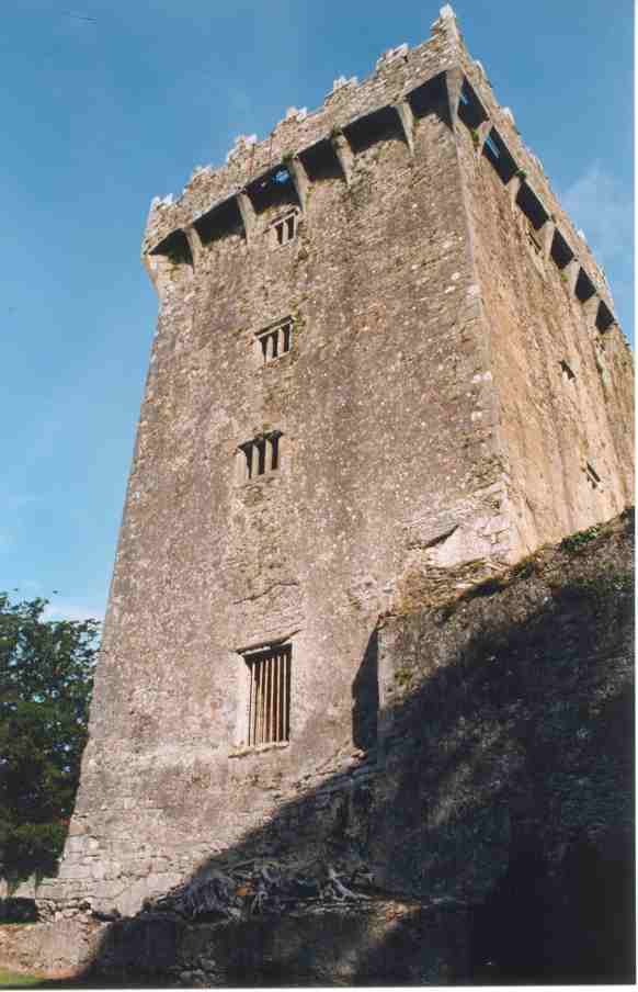 Nördlich der Hafenstadt Cork liegt Blarney Castle. Dessen Erbauer, Lord Blarney hat es einmal mit seiner Überredungskunst fertiggebracht die Königin Elisabeth zu überzeugen. Daher stammt das Redewort "This is all Blarney". Man kann heutzutage den berühmten "Blarney Stone" rücklings liegend küssen, der sich in der Mitte der Mauerbrüstung auf dem Bild nebenan befindet. Das soll angeblich Beredsamkeit erzeugen. Naja. |