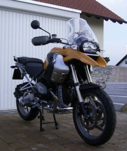 | Nach 1100 kommt 1200 und so kaufte ich mir im April 2009 eine BMW R 1200 GS, genannt Liesl, in Namibia Orange mit allen elektronischen Helferlein: Integral ABS, ASC, RDC, ESA, Griffheizung sowieso und gleich die BMW Koffer dazu. Die Farbe, ganz einfach, damit man sie auf einem großen Motorradparkplatz auch wieder findet und weils einfach schön ist. Bis jetzt mein stärkstes eigenes Moped, aber man soll sich ja keine Grenzen setzen. Ein Garmin ZUMO 550 hat auch noch Platz gefunden um die Informationsflut im Cockpit noch zu steigern. | ![]() |